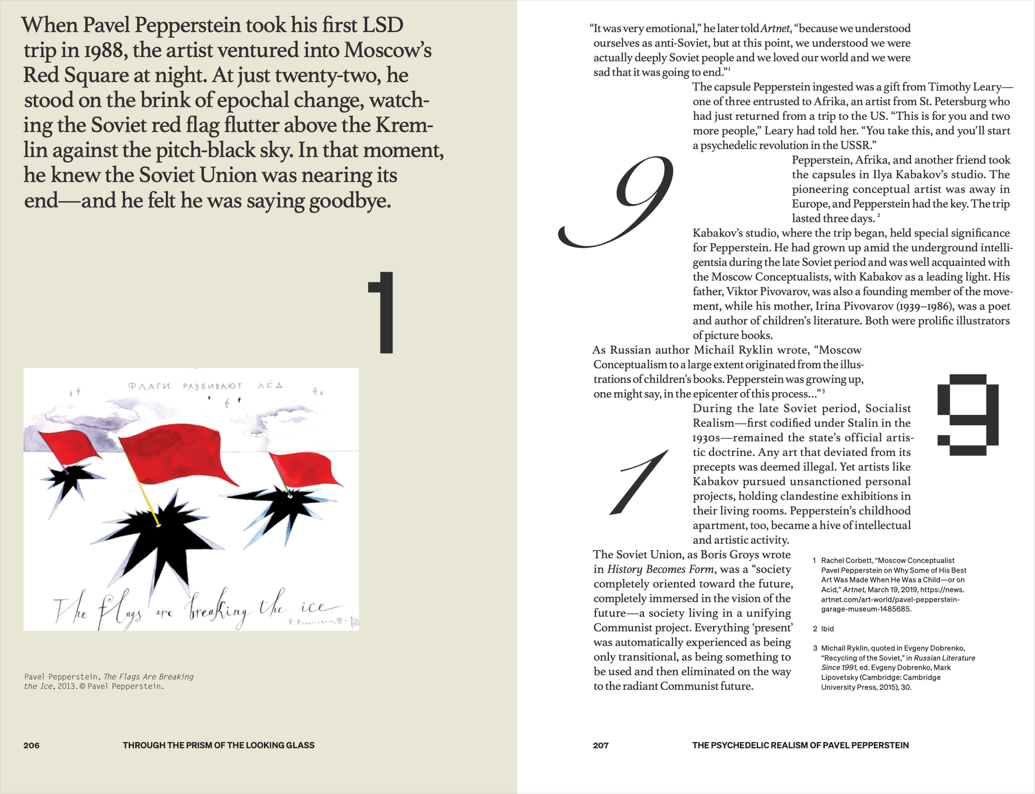 Pavel Pepperstein — An interview with the Russian artist and novelist on the influence of children’s literature and hallucinogenics in conjuring his surreal futuristic landscapes—a style he calls “psychedelic realism.” The interview is accompanied by a text introducing the artist broadly, from his first LSD trip in Moscow’s Red Square near the end of the Soviet Union to his involvement in the collective Inspection Medical Hermeneutics, which dissolved following 9/11.